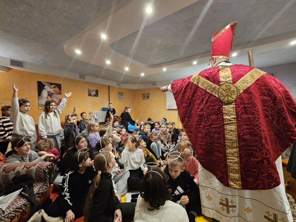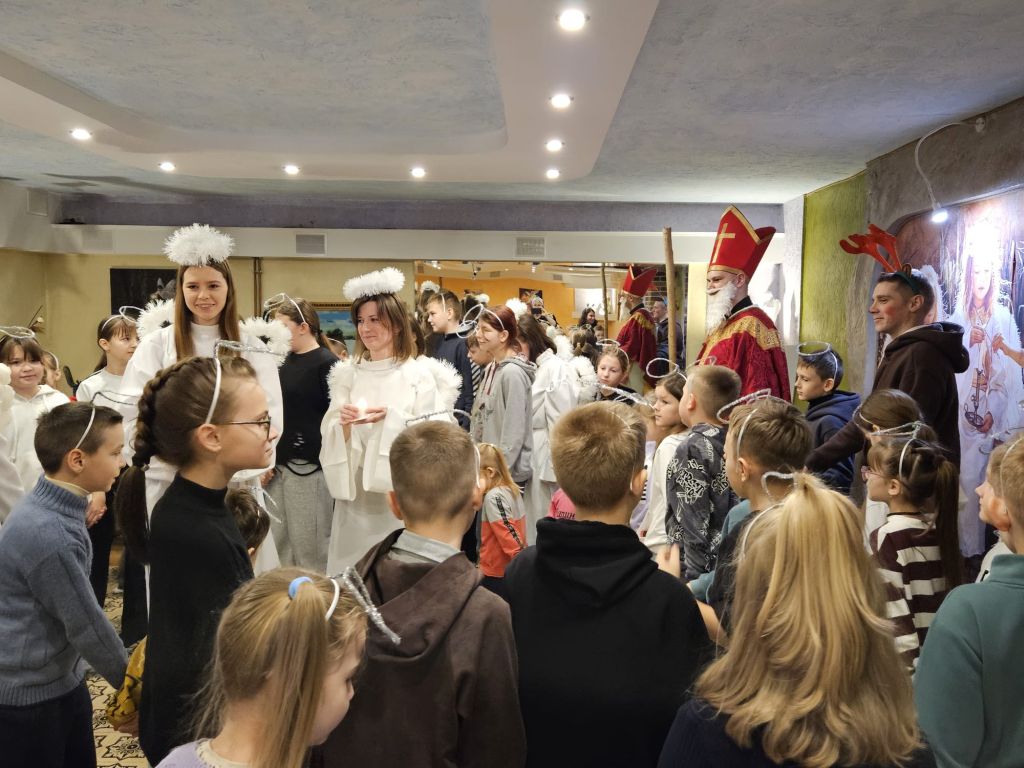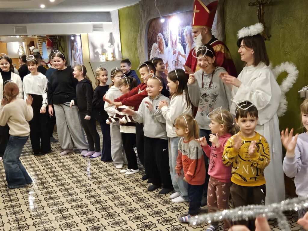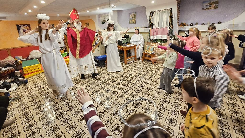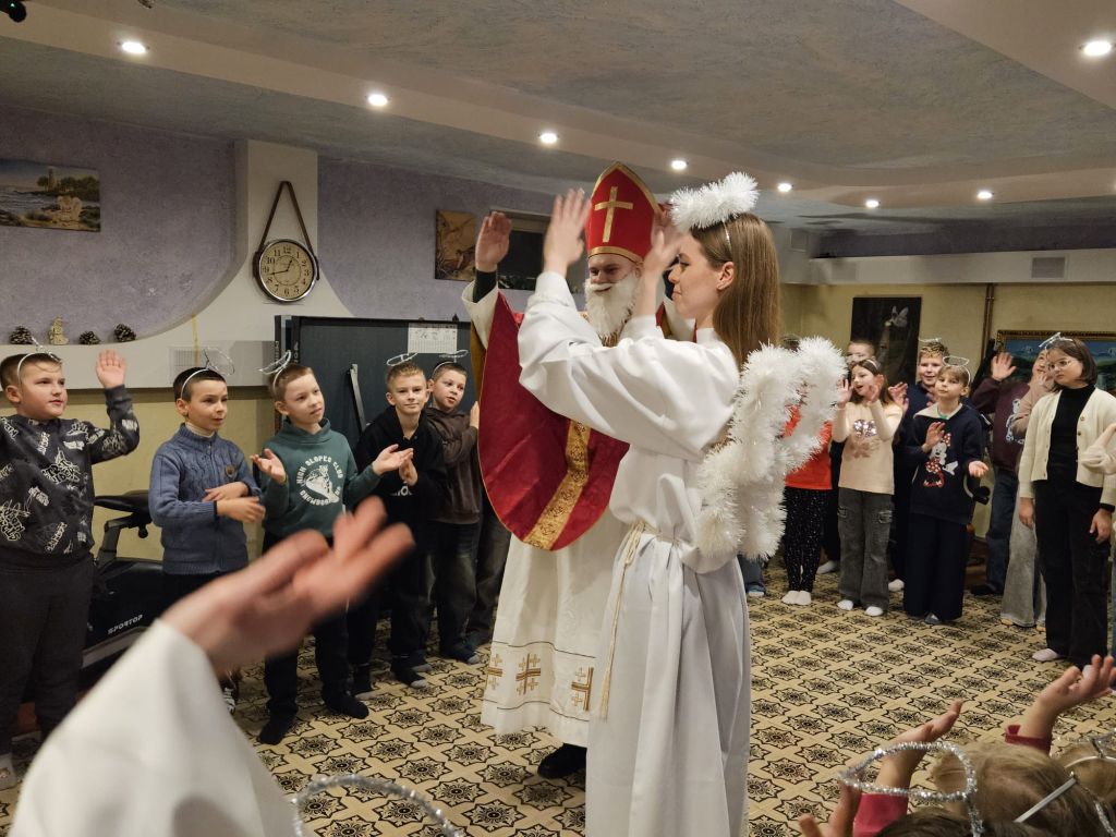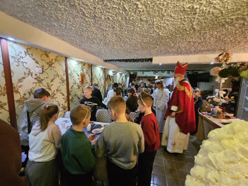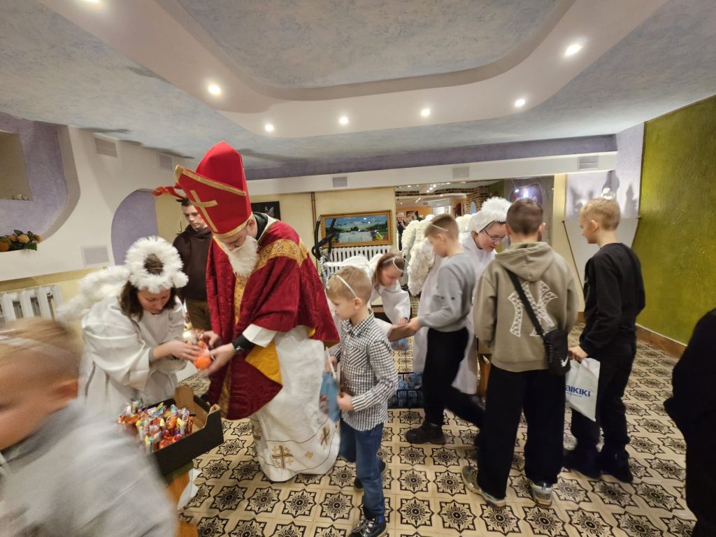 San Nicolás en la sala de actividades para niños en Szydłowicze, Bielorrusia, 6 de diciembre de 2025