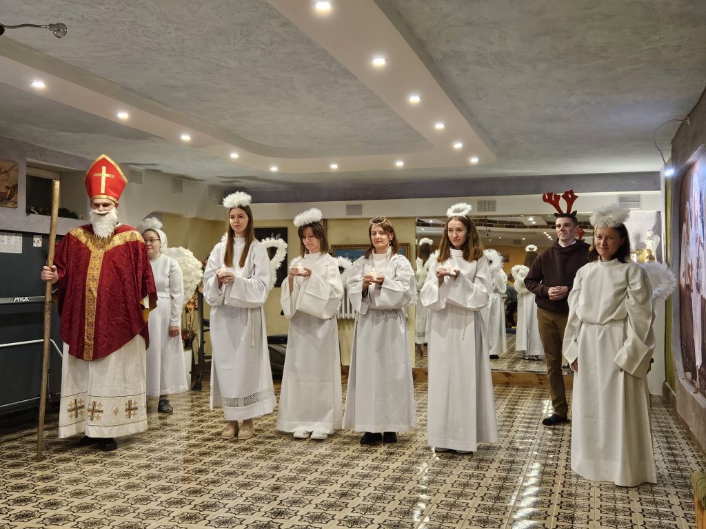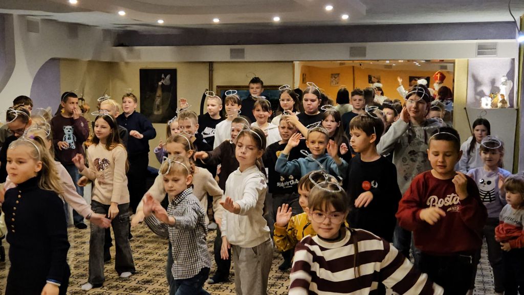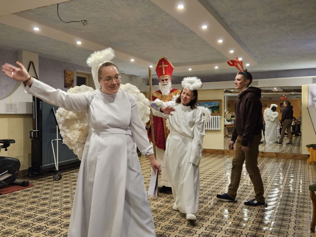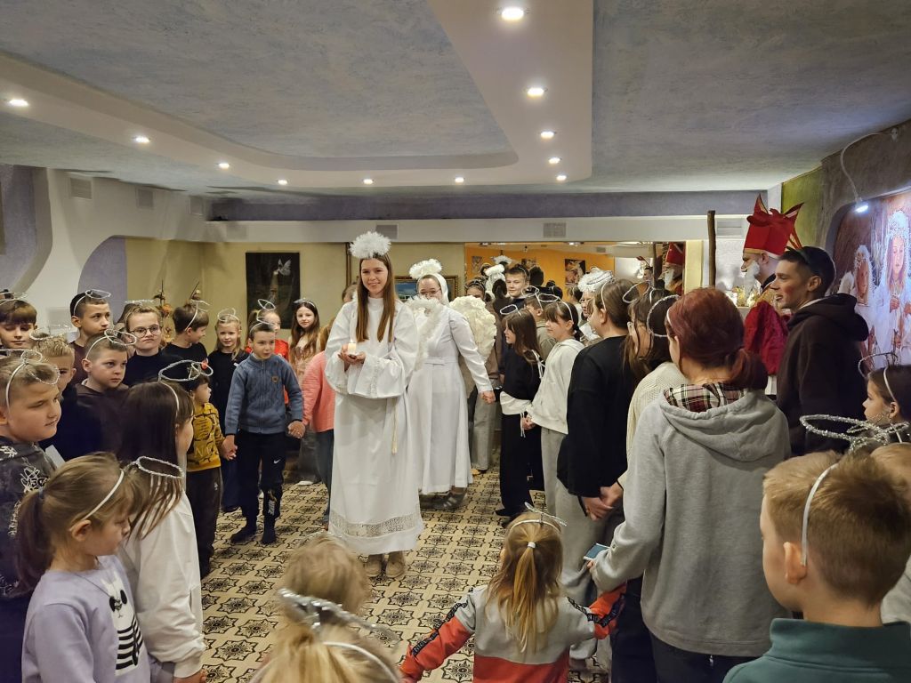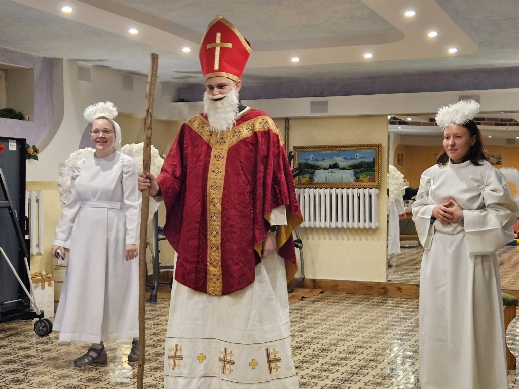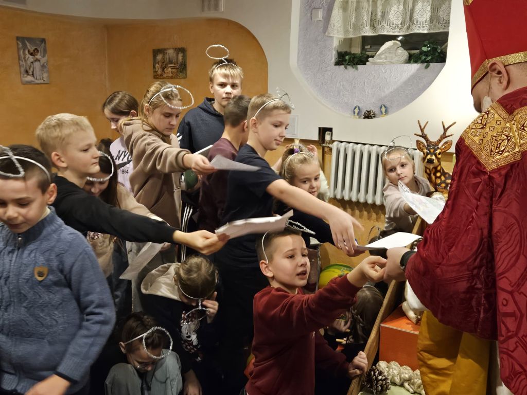 San Nicolás en la sala de actividades para niños en Szydłowicze, Bielorrusia, 6 de diciembre de 2025